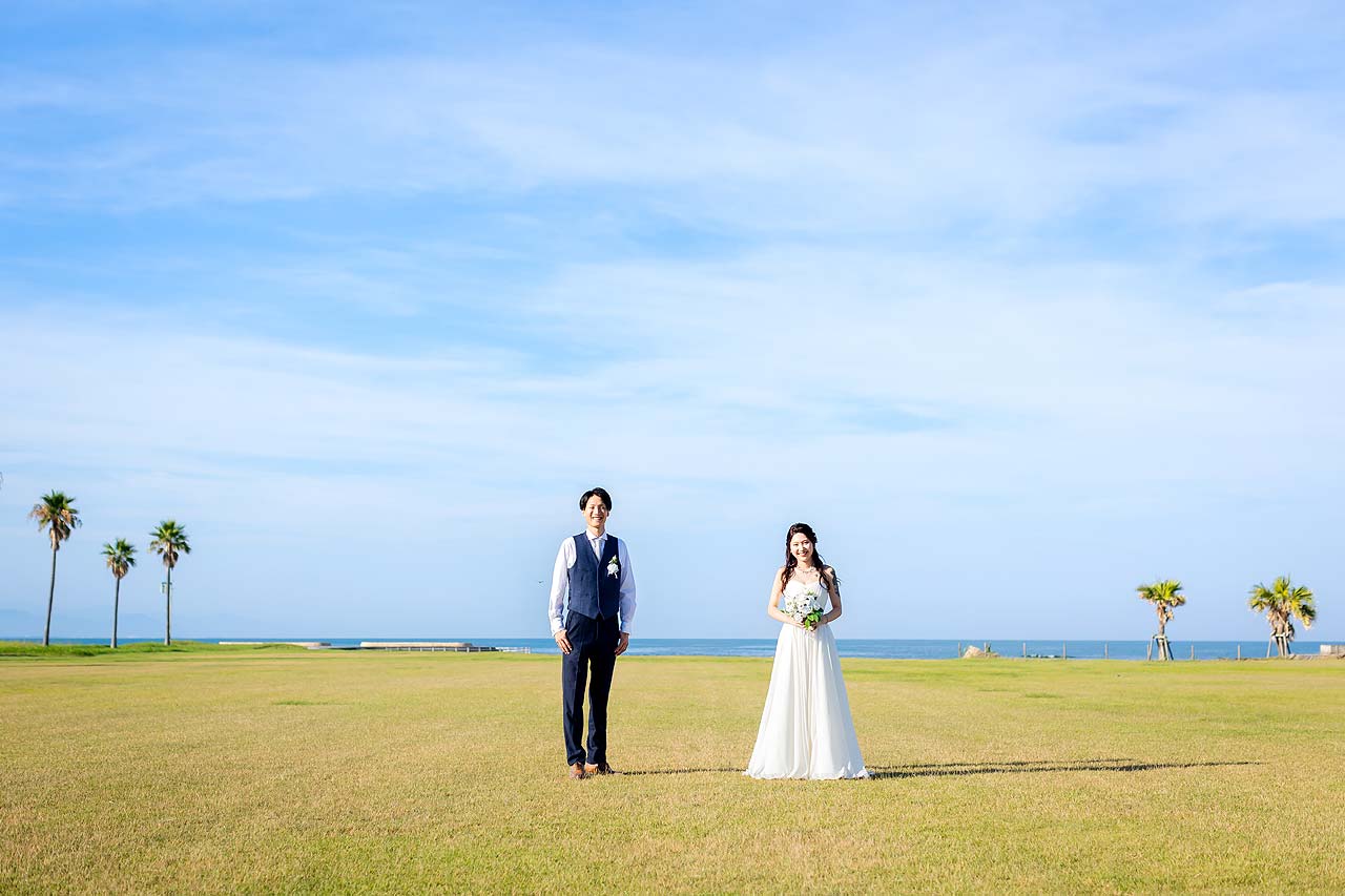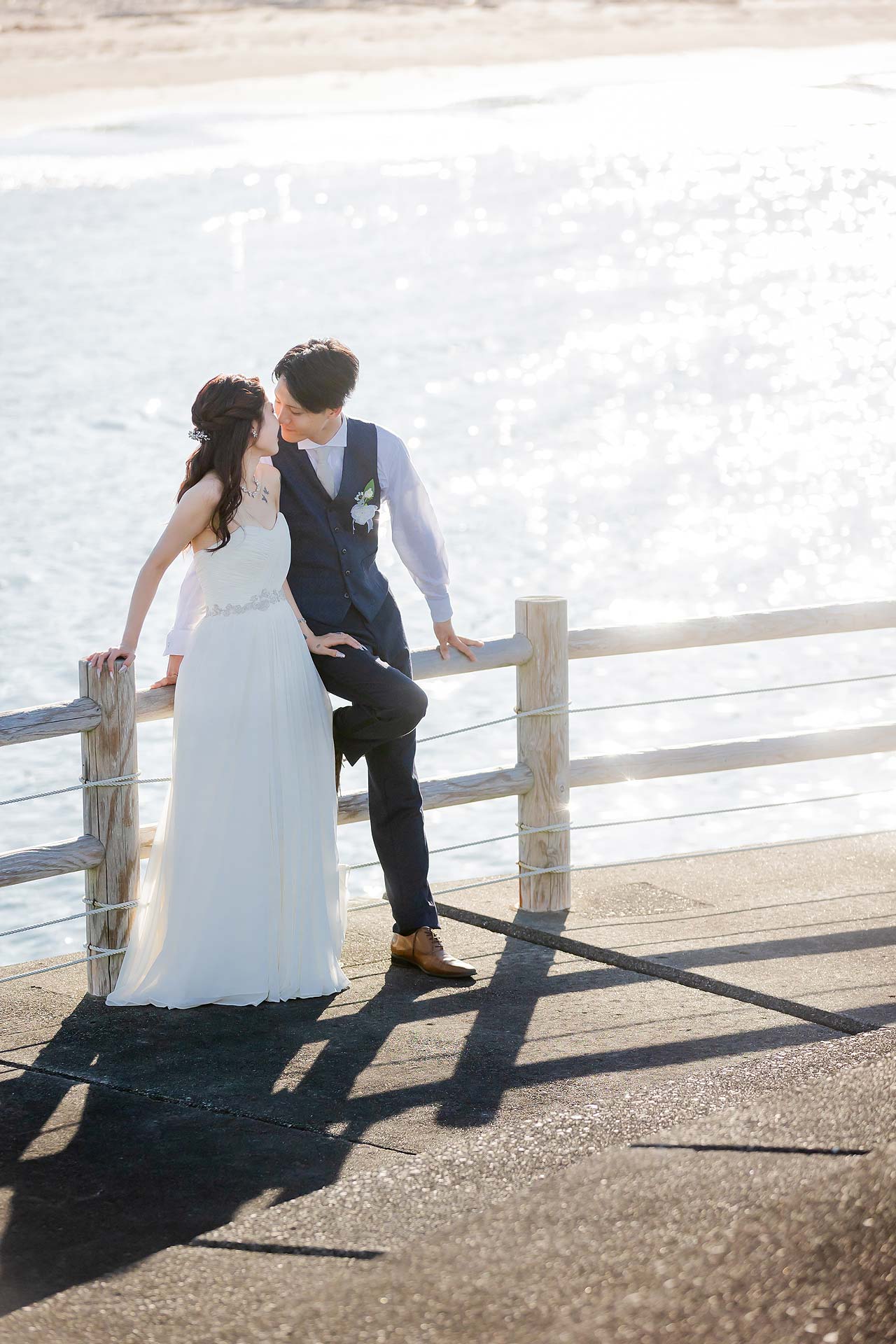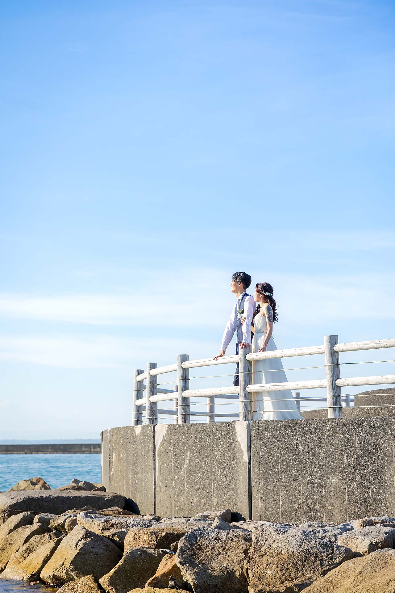 海と水平線を背景にしたロケーションでドラマチックなフォトウエディングを楽しめます
