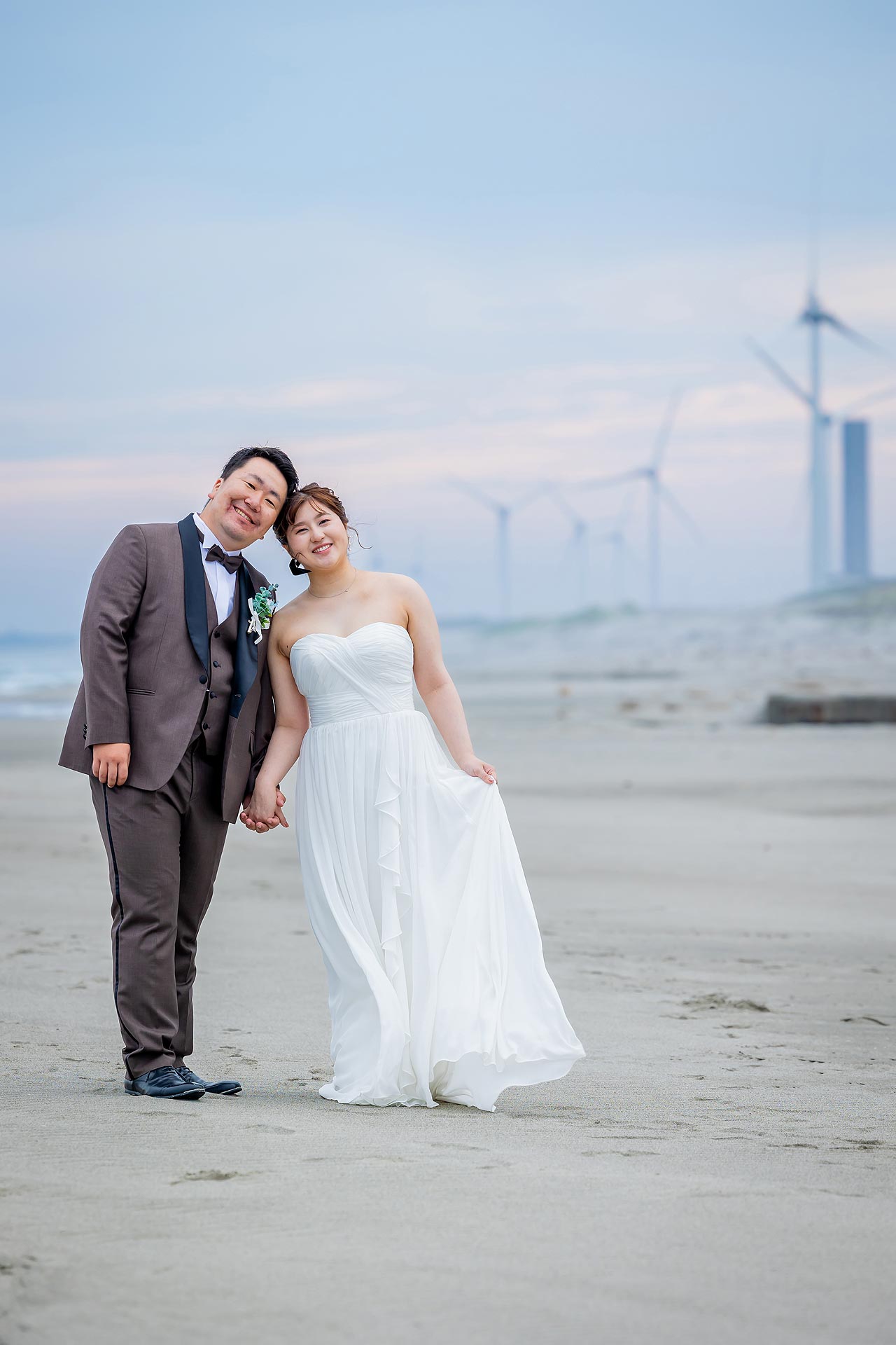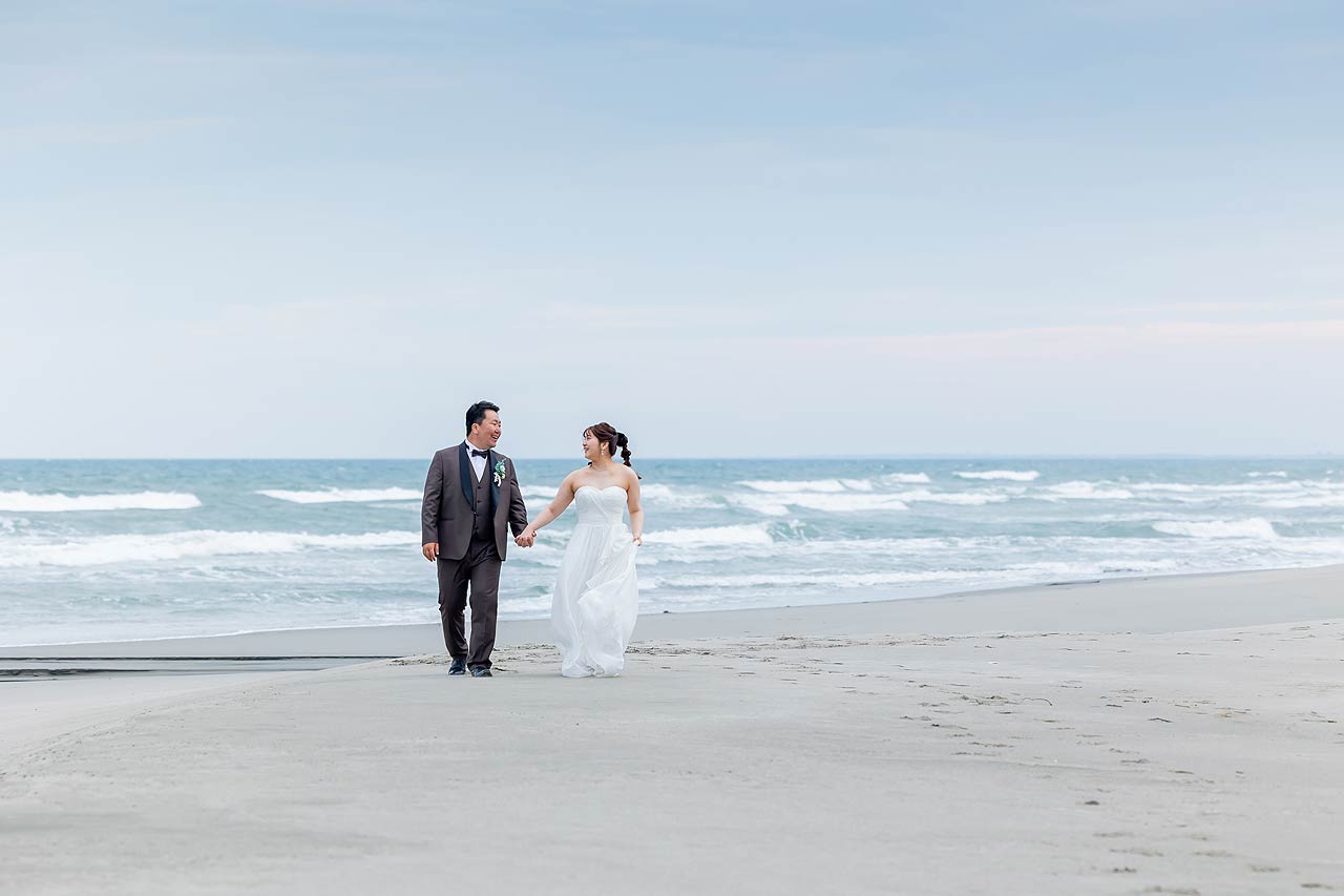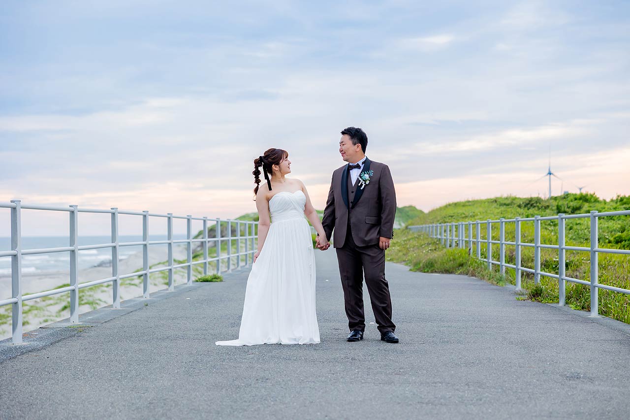 海と水平線を背景にしたロケーションでドラマチックなフォトウエディングを楽しめます