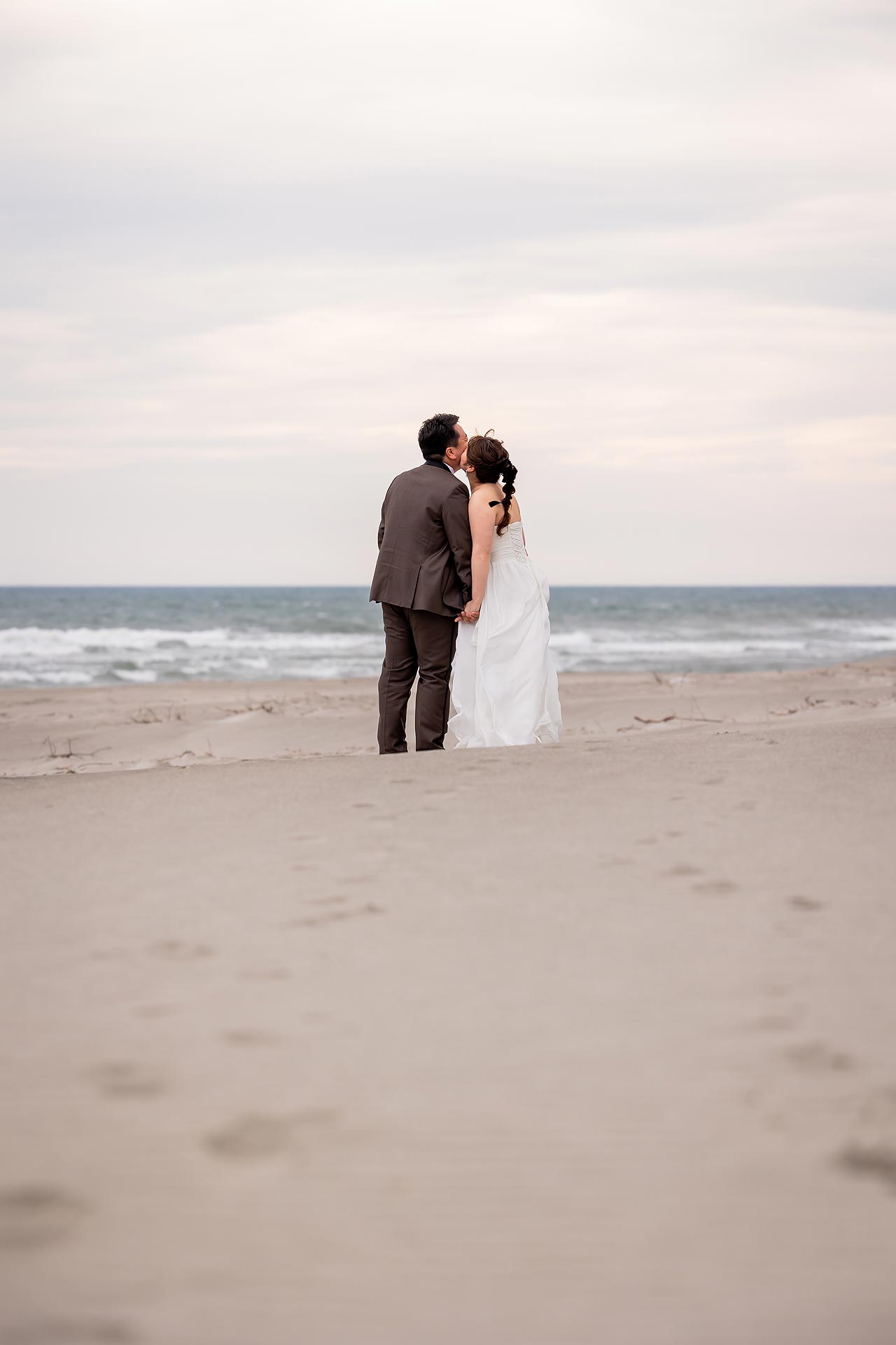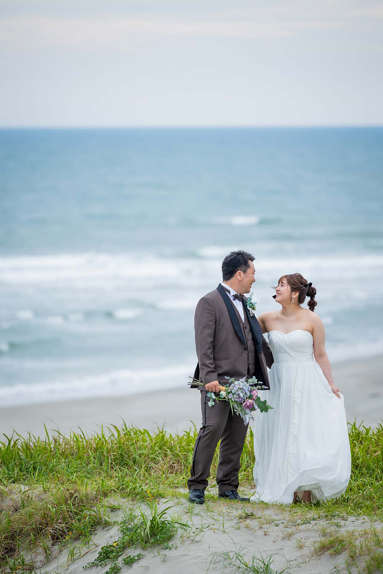 海と水平線を背景にしたロケーションでドラマチックなフォトウエディングを楽しめます